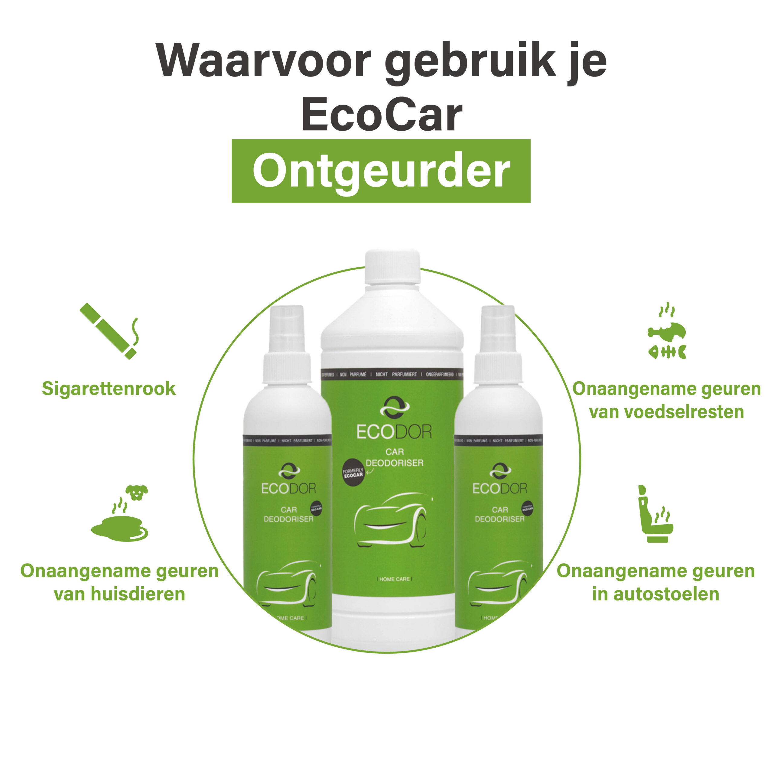 EcoCar breaks down the odour molecules in the air in a natural way, making the smell disappear instead of spraying another smell over the top of it. EcoCar is ideal for eliminating food smells, tobacco smells and pet odour. EcoCar is non-irritant and non-allergenic. EcoCar is produced from harmless, water-soluble vegetable proteins. This makes EcoCar safe for use in the immediate vicinity of humans, animals and food. Contains no propellant. Leaves no stains.